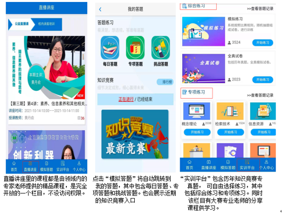 【首页】【直播讲座】【模拟答题】【实训平台】【个人中心】 ,以下是对应功能应用的图示操作流程。